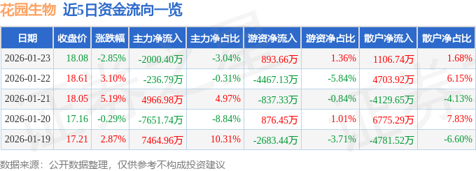 证券之星消息,截至2026年1月23日收盘,花园生物(300401)报收于18.08元,下跌2.85%,换手率6.78%,成交量36.24万手,成交额6.57亿元。