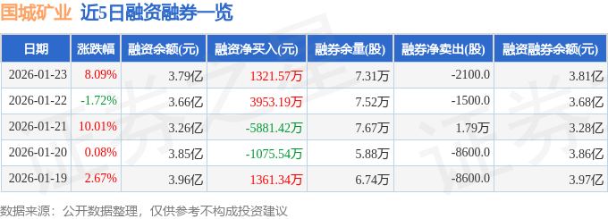 证券之星消息,截至2026年1月23日收盘,国城矿业(000688)报收于29.66元,上涨8.09%,换手率3.4%,成交量40.35万手,成交额11.8亿元。
