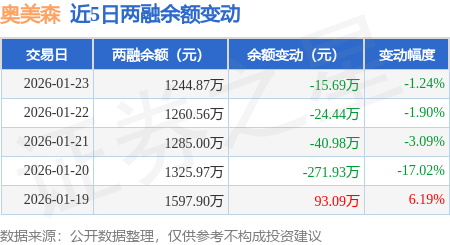 证券之星消息,1月23日,奥美森(920080)融资买入67.54万元,融资偿还83.23万元,融资净卖出15.69万元,融资余额1244.87万元,近20个交易日中有11个交易日出现融资净买入。