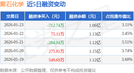 证券之星消息,1月23日,聚石化学(688669)融资买入556.59万元,融资偿还1269.32万元,融资净卖出712.74万元,融资余额1.06亿元。