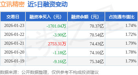 证券之星消息,1月23日,立讯精密(002475)融资买入6.96亿元,融资偿还7.13亿元,融资净卖出1701.04万元,融资余额70.37亿元,近20个交易日中有11个交易日出现融资净买入。