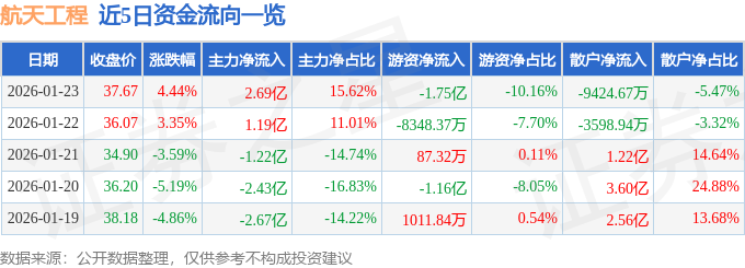 1月23日的资金流向数据方面,主力资金净流入2.69亿元,占总成交额15.62%,游资资金净流出1.75亿元,占总成交额10.16%,散户资金净流出9424.67万元,占总成交额5.47%。