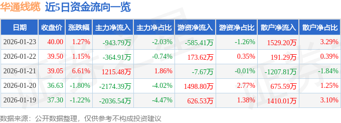 证券之星1月26日盘中消息,14点38分华通线缆(605196)触及涨停板。其所属行业电网设备目前下跌。领涨股为华通线缆。该股为油服,油气管网,风电概念热股,当日油服概念上涨2.23%,油气管网概念上涨0.22%。