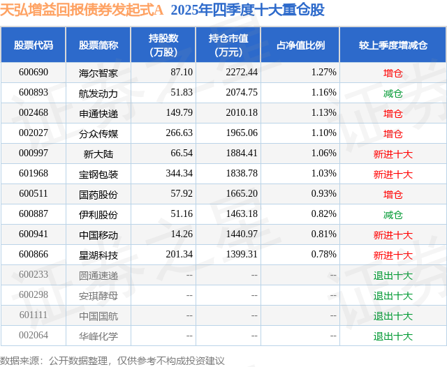 天弘增益回报债券发起式A的前十大重仓股如下: