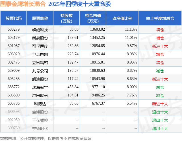 根据2025基金年报公募基金重仓股数据,重仓该股的公募基金共5家,其中持有数量最多的公募基金为国泰基金的国泰金鹰增长混合。国泰金鹰增长混合目前规模为12.22亿元,最新净值1.7637(1月23日),较上一交易日上涨1.32%,近一年上涨58.45%。该公募基金现任基金经理为徐治彪。徐治彪在任的基金产品包括:国泰大健康股票A,管理时间为2017年10月30日至今,期间收益率为74.75%;国泰研究精选两年持有混合,管理时间为2019年12月24日至今,期间收益率为207.73%;国泰价值经典混合(LOF),管理时间为2020年7月24日至今,期间收益率为50.45%。