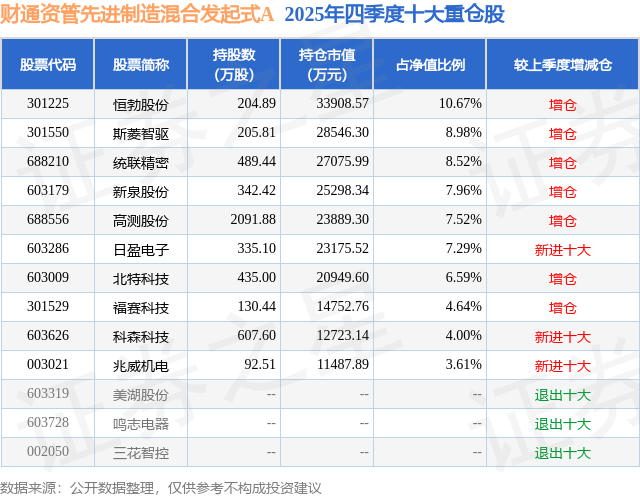 根据2025基金年报公募基金重仓股数据,重仓该股的公募基金共4家,其中持有数量最多的公募基金为财通资管的财通资管先进制造混合发起式A。财通资管先进制造混合发起式A目前规模为4.09亿元,最新净值2.35(1月23日),较上一交易日下跌0.69%,近一年上涨119.3%。该公募基金现任基金经理为徐竞择。