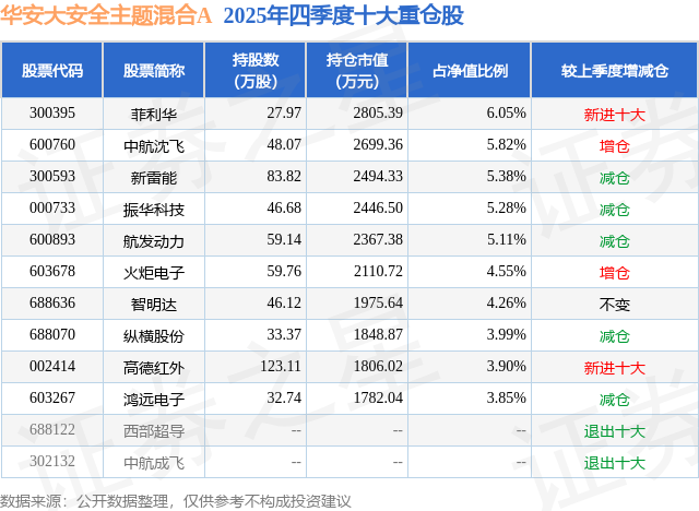 根据2025基金年报公募基金重仓股数据,重仓该股的公募基金共6家,其中持有数量最多的公募基金为华安基金的华安大安全主题混合A。华安大安全主题混合A目前规模为2.85亿元,最新净值3.184(1月23日),较上一交易日上涨2.51%,近一年上涨61.95%。该公募基金现任基金经理为舒灏。舒灏在任的基金产品包括:华安新机遇灵活配置混合A,管理时间为2018年11月12日至今,期间收益率为60.53%;华安添禧一年持有期混合A,管理时间为2021年6月4日至今,期间收益率为14.28%;华安鼎安优选一年持有混合A,管理时间为2022年6月2日至今,期间收益率为25.57%。