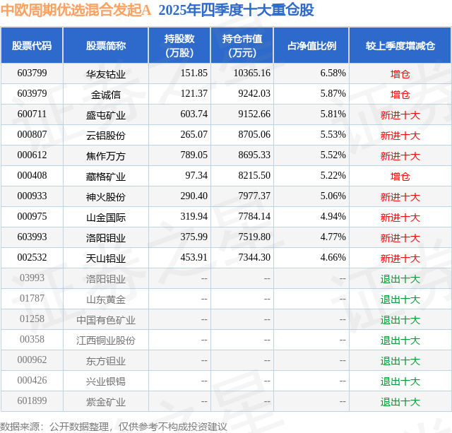 中欧周期优选混合发起A的前十大重仓股如下: