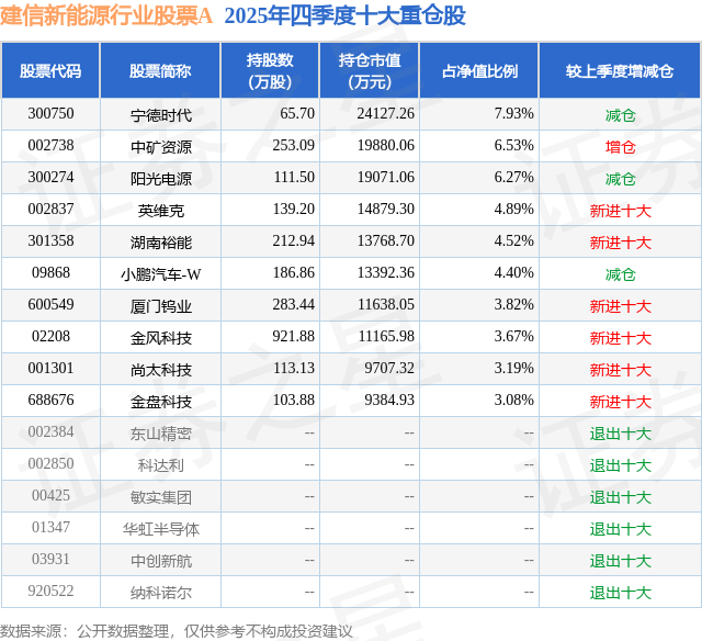根据2025基金年报公募基金重仓股数据,重仓该股的公募基金共29家,其中持有数量最多的公募基金为建信基金的建信新能源行业股票A。建信新能源行业股票A目前规模为26.95亿元,最新净值2.1884(1月23日),较上一交易日上涨3.64%,近一年上涨52.4%。该公募基金现任基金经理为陶灿 田元泉。陶灿在任的基金产品包括:建信改革红利股票A,管理时间为2014年5月14日至今,期间收益率为509.6%;建信高股息主题股票,管理时间为2020年1月21日至今,期间收益率为128.12%;建信兴润一年持有混合,管理时间为2021年8月24日至今,期间收益率为-9.57%。田元泉在任的基金产品包括:建信智能汽车股票,管理时间为2021年9月10日至今,期间收益率为1.76%;建信研究精选混合A,管理时间为2024年6月12日至今,期间收益率为71.98%;建信稳定得利债券A,管理时间为2025年9月5日至今,期间收益率为2.77%。