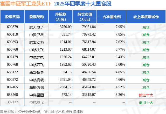 根据2025基金年报公募基金重仓股数据,重仓该股的公募基金共19家,其中持有数量最多的公募基金为富国基金的富国中证军工龙头ETF。富国中证军工龙头ETF目前规模为100.58亿元,最新净值0.9199(1月23日),较上一交易日上涨2.53%,近一年上涨58.17%。该公募基金现任基金经理为王乐乐 牛志冬。王乐乐在任的基金产品包括:富国中证消费50ETF,管理时间为2019年10月14日至今,期间收益率为15.39%;富国中证科技50策略ETF,管理时间为2019年11月15日至今,期间收益率为98.36%;富国中证科技50策略ETF联接A,管理时间为2020年2月20日至今,期间收益率为49.51%。牛志冬在任的基金产品包括:富国中证移动互联网指数(LOF)A,管理时间为2015年5月13日至今,期间收益率为6.73%;富国中证医药主题指数增强A,管理时间为2016年11月11日至今,期间收益率为49.67%;富国中证娱乐主题指数增强(LOF)A,管理时间为2017年3月13日至今,期间收益率为-8.96%;