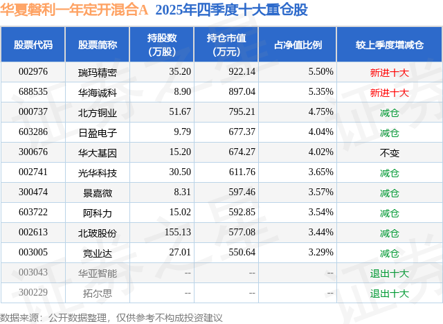 华夏磐利一年定开混合A的前十大重仓股如下: