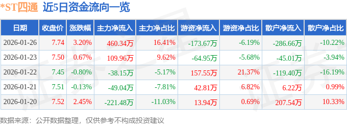 证券之星消息,截至2026年1月26日收盘,*ST四通(603838)报收于7.74元,上涨3.2%,换手率1.13%,成交量3.61万手,成交额2805.68万元。