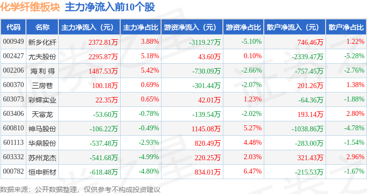 从资金流向上来看,当日化学纤维板块主力资金净流出5.28亿元,游资资金净流入8815.93万元,散户资金净流入4.4亿元。化学纤维板块个股资金流向见下表:
