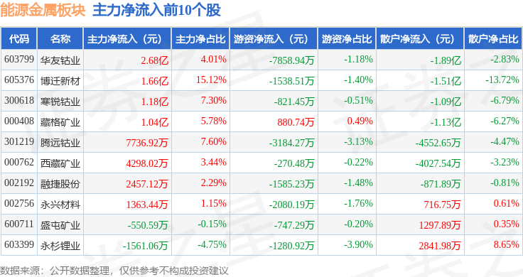 从资金流向上来看,当日能源金属板块主力资金净流入9860.35万元,游资资金净流出6425.58万元,散户资金净流出3434.77万元。能源金属板块个股资金流向见下表: