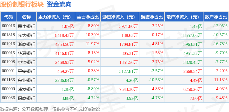 从资金流向上来看,当日股份制银行板块主力资金净流出2.44亿元,游资资金净流出6.94亿元,散户资金净流入9.38亿元。股份制银行板块个股资金流向见下表: