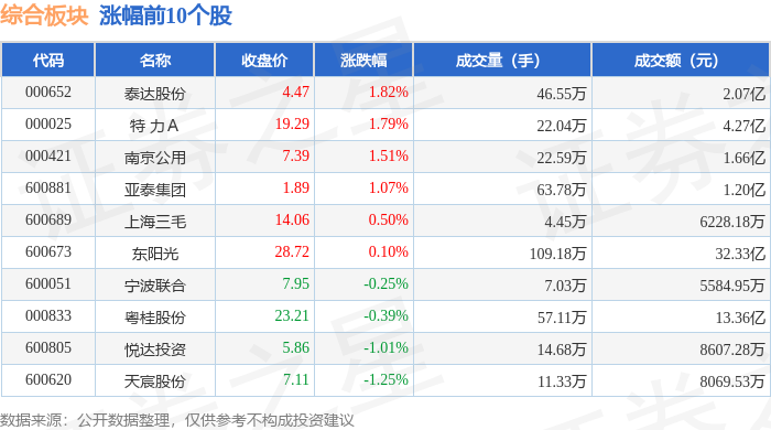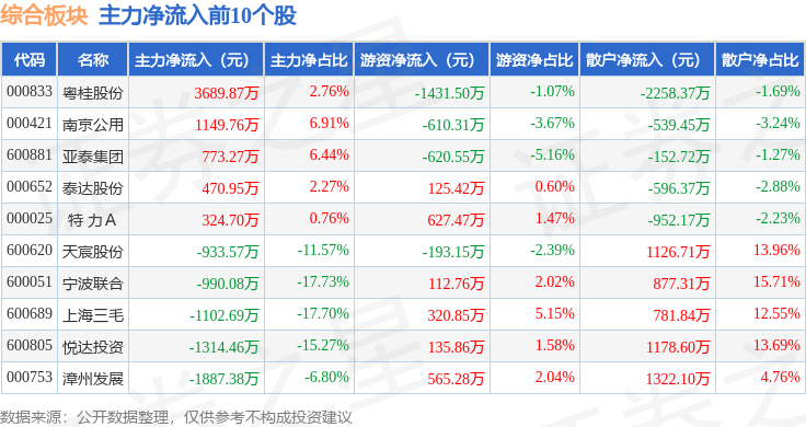从资金流向上来看,当日综合板块主力资金净流出1.75亿元,游资资金净流入9588.69万元,散户资金净流入7894.95万元。综合板块个股资金流向见下表: