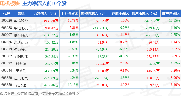 从资金流向上来看,当日电机板块主力资金净流出18.43亿元,游资资金净流入2.25亿元,散户资金净流入16.18亿元。电机板块个股资金流向见下表: