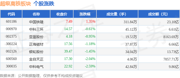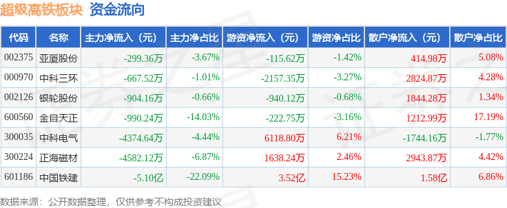 从资金流向上来看,当日超级高铁板块主力资金净流出6.28亿元,游资资金净流入3.95亿元,散户资金净流入2.33亿元。超级高铁板块个股资金流向见下表: