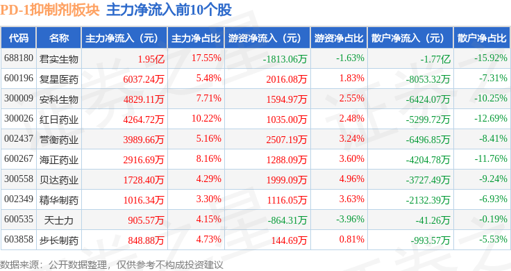 从资金流向上来看,当日PD-1抑制剂板块主力资金净流入1.84亿元,游资资金净流出6466.21万元,散户资金净流出1.19亿元。PD-1抑制剂板块个股资金流向见下表: