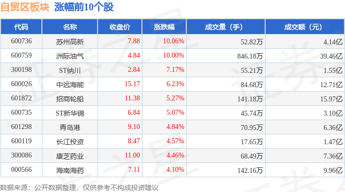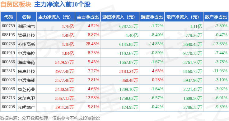 从资金流向上来看,当日自贸区板块主力资金净流出65.21亿元,游资资金净流入14.91亿元,散户资金净流入50.29亿元。自贸区板块个股资金流向见下表: