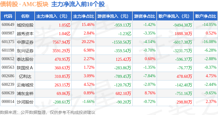 从资金流向上来看,当日债转股 · AMC板块主力资金净流出4.31亿元,游资资金净流入4935.77万元,散户资金净流入3.82亿元。债转股 · AMC板块个股资金流向见下表: