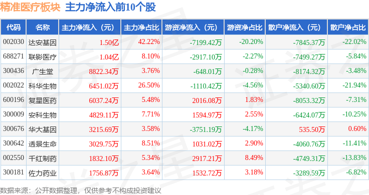 从资金流向上来看,当日精准医疗板块主力资金净流入3.3亿元,游资资金净流入1.24亿元,散户资金净流出4.53亿元。精准医疗板块个股资金流向见下表: