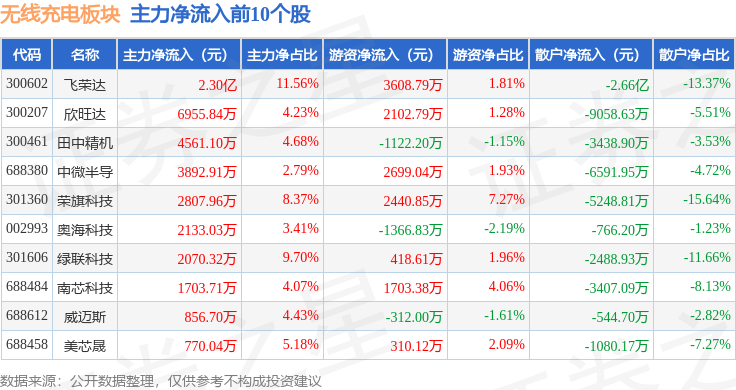 从资金流向上来看,当日无线充电板块主力资金净流出57.59亿元,游资资金净流入18.62亿元,散户资金净流入38.97亿元。无线充电板块个股资金流向见下表: