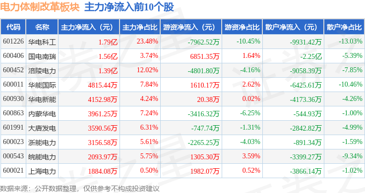 从资金流向上来看,当日电力体制改革板块主力资金净流出8.1亿元,游资资金净流入1.48亿元,散户资金净流入6.62亿元。电力体制改革板块个股资金流向见下表: