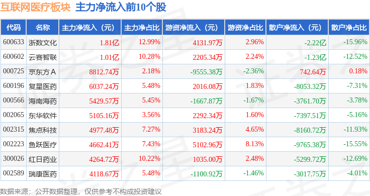 从资金流向上来看,当日互联网医疗板块主力资金净流出19.92亿元,游资资金净流入8.16亿元,散户资金净流入11.77亿元。互联网医疗板块个股资金流向见下表: