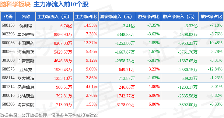 从资金流向上来看,当日脑科学板块主力资金净流出65.66亿元,游资资金净流入11.59亿元,散户资金净流入54.07亿元。脑科学板块个股资金流向见下表:
