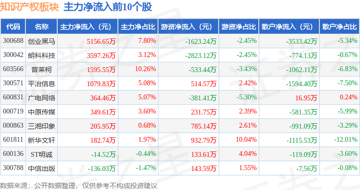 从资金流向上来看,当日知识产权板块主力资金净流出18.67亿元,游资资金净流入5.72亿元,散户资金净流入12.96亿元。知识产权板块个股资金流向见下表: