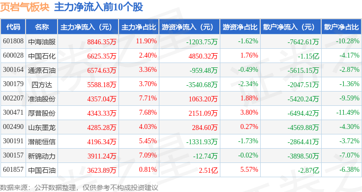 从资金流向上来看,当日页岩气板块主力资金净流入1.88亿元,游资资金净流入3.14亿元,散户资金净流出5.03亿元。页岩气板块个股资金流向见下表: