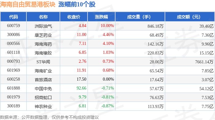 从资金流向上来看,当日海南自由贸易港板块主力资金净流出9.42亿元,游资资金净流入4.38亿元,散户资金净流入5.04亿元。海南自由贸易港板块个股资金流向见下表: