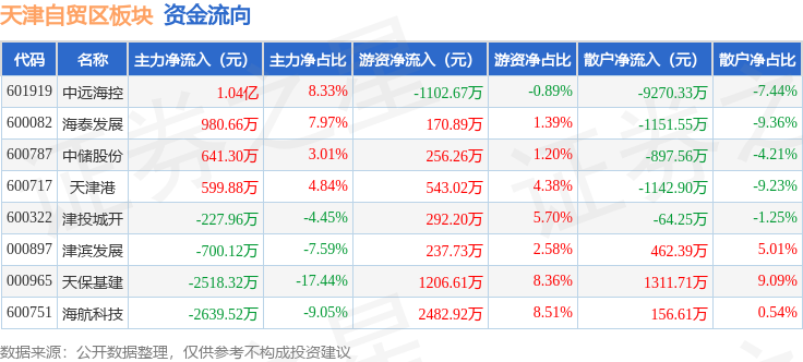从资金流向上来看,当日天津自贸区板块主力资金净流入6508.92万元,游资资金净流入4086.96万元,散户资金净流出1.06亿元。天津自贸区板块个股资金流向见下表: