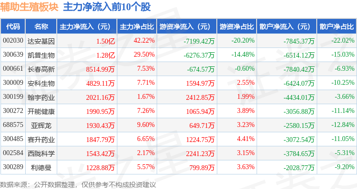 从资金流向上来看,当日辅助生殖板块主力资金净流入1.94亿元,游资资金净流入4933.98万元,散户资金净流出2.44亿元。辅助生殖板块个股资金流向见下表: