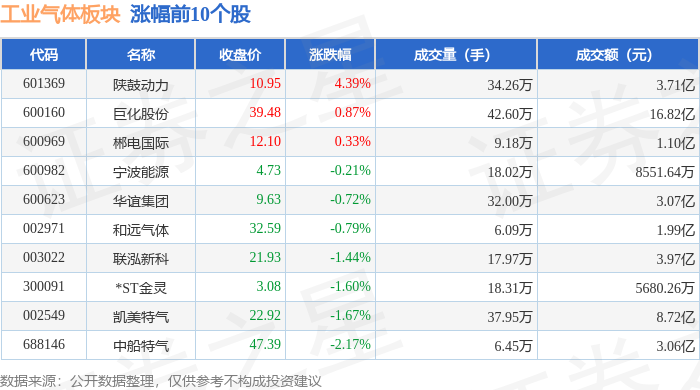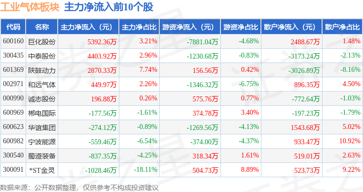 从资金流向上来看,当日工业气体板块主力资金净流出13.36亿元,游资资金净流入2.18亿元,散户资金净流入11.18亿元。工业气体板块个股资金流向见下表:
