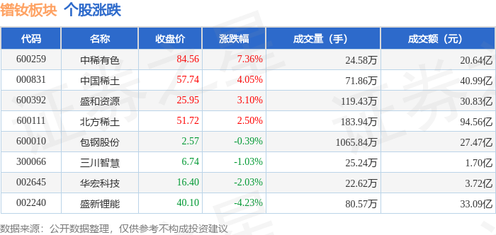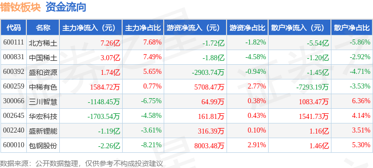 从资金流向上来看,当日镨钕板块主力资金净流入8.49亿元,游资资金净流出2.46亿元,散户资金净流出6.04亿元。镨钕板块个股资金流向见下表: