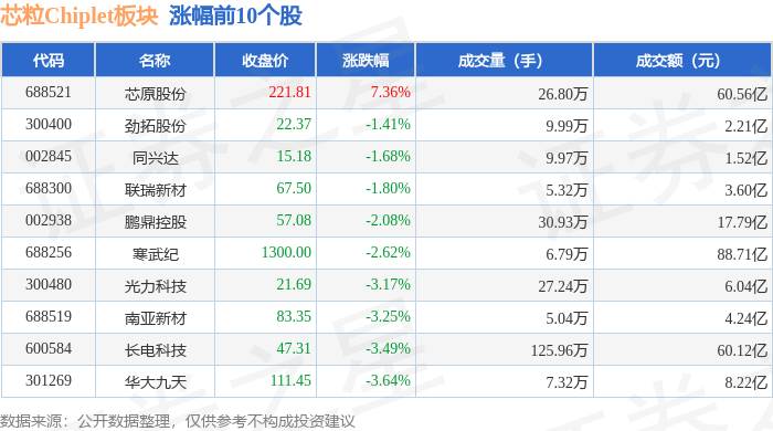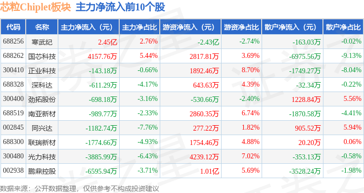 从资金流向上来看,当日芯粒Chiplet板块主力资金净流出46.05亿元,游资资金净流入9.15亿元,散户资金净流入36.9亿元。芯粒Chiplet板块个股资金流向见下表: