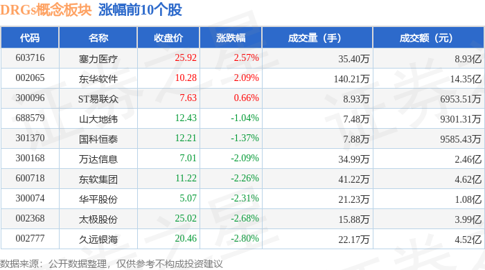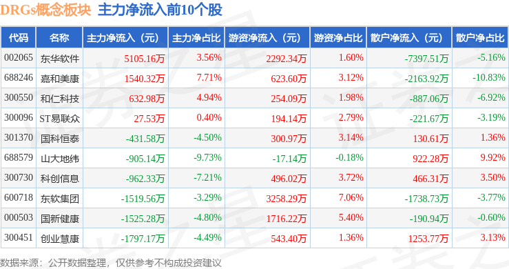从资金流向上来看,当日DRGs概念板块主力资金净流出7.06亿元,游资资金净流入3.11亿元,散户资金净流入3.95亿元。DRGs概念板块个股资金流向见下表: