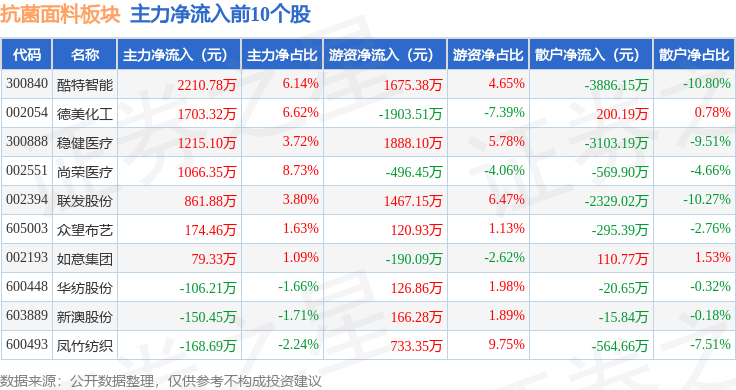 从资金流向上来看,当日抗菌面料板块主力资金净流出3.02亿元,游资资金净流入1.97亿元,散户资金净流入1.05亿元。抗菌面料板块个股资金流向见下表: