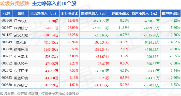 从资金流向上来看,当日垃圾分类板块主力资金净流出9.25亿元,游资资金净流入4488.58万元,散户资金净流入8.8亿元。垃圾分类板块个股资金流向见下表:
