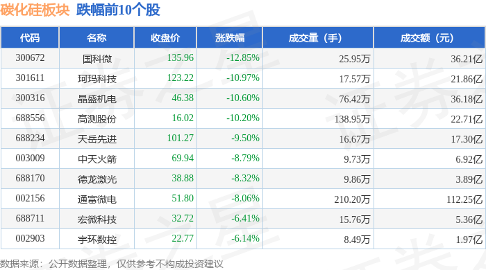 从资金流向上来看,当日碳化硅板块主力资金净流出51.63亿元,游资资金净流入18.04亿元,散户资金净流入33.59亿元。碳化硅板块个股资金流向见下表: