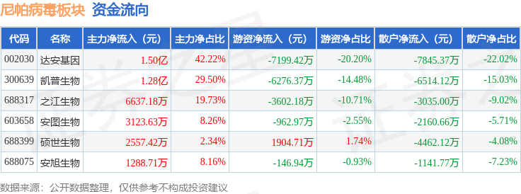 从资金流向上来看,当日尼帕病毒板块主力资金净流入4.14亿元,游资资金净流出1.63亿元,散户资金净流出2.52亿元。尼帕病毒板块个股资金流向见下表: