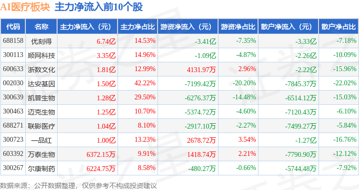 从资金流向上来看,当日AI医疗板块主力资金净流出15.52亿元,游资资金净流入8705.23万元,散户资金净流入14.65亿元。AI医疗板块个股资金流向见下表: