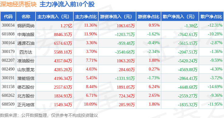 从资金流向上来看,当日深地经济板块主力资金净流入8570.4万元,游资资金净流入1.73亿元,散户资金净流出2.59亿元。深地经济板块个股资金流向见下表: