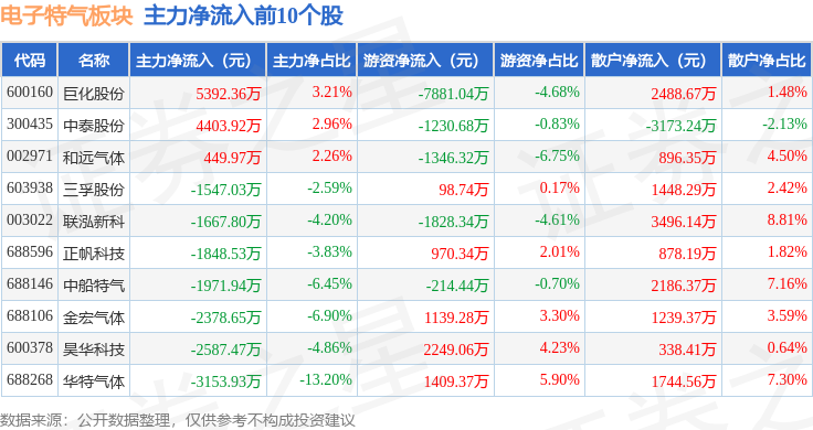 从资金流向上来看,当日电子特气板块主力资金净流出10.93亿元,游资资金净流入1.11亿元,散户资金净流入9.82亿元。电子特气板块个股资金流向见下表: