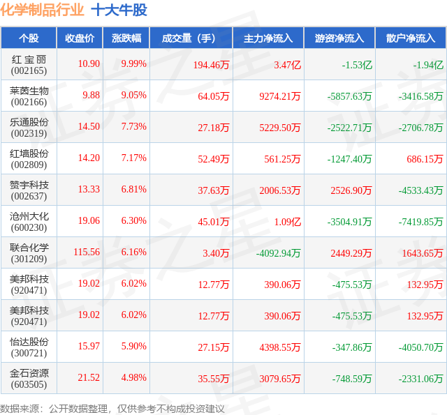 个股表现方面,化学制品行业当日领涨股为红 宝 丽(002165),该股当日报收10.9,上涨9.99%,成交量194.46万,主力资金净流入3.47亿元。莱茵生物(002166)以上涨9.05%紧随其后,该股当日成交量64.05万,主力资金净流入9274.21万元。除此之外,乐通股份(002319)、红墙股份(002809)、赞宇科技(002637)均进入当日牛股之列。具体个股列表见下表: