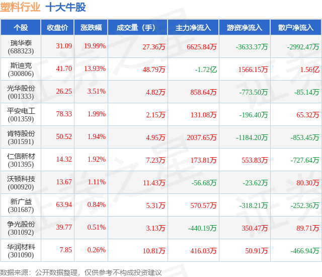 个股表现方面,塑料行业当日领涨股为瑞华泰(688323),该股当日报收31.09,上涨19.99%,成交量27.36万,主力资金净流入6625.84万元。斯迪克(300806)以上涨13.93%紧随其后,该股当日成交量48.79万,主力资金净流出1.72亿元。除此之外,光华股份(001333)、平安电工(001359)、肯特股份(301591)均进入当日牛股之列。具体个股列表见下表:
