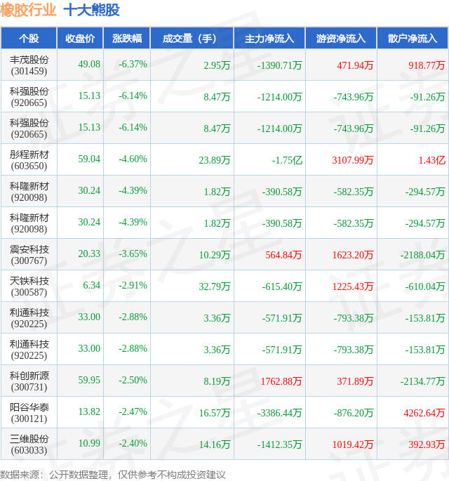个股表现方面,橡胶行业当日领跌股为丰茂股份(301459),该股当日报收49.08,下跌6.37%,成交量2.95万,主力资金净流出1390.71万元。科强股份(920665)以下跌6.14%紧随其后,该股当日成交量8.47万,主力资金净流出1214.0万元。除此之外,科强股份(920665)、彤程新材(603650)、科隆新材(920098)均进入当日熊股之列。具体个股列表见下表: