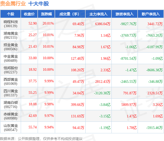 个股表现方面,贵金属行业当日领涨股为晓程科技(300139),该股当日报收52.9,上涨20.01%,成交量69.4万,主力资金净流入6386.04万元。湖南黄金(002155)以上涨10.01%紧随其后,该股当日成交量7.96万,主力资金净流入1.14亿元。除此之外,招金黄金(000506)、中金黄金(600489)、恒邦股份(002237)均进入当日牛股之列。具体个股列表见下表: